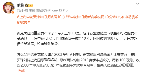 记者: 上海申花和天津津门虎被罚10分, 同时被罚100万元