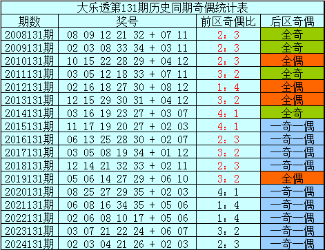 后区分析:在第131期历史同期开奖中,后区奖号奇偶比为17:17,最近5年同期后区奇偶走势为:一奇一偶、一奇一偶、一奇一偶、一奇一偶、一奇一偶,今年同期看好再出一奇一偶组合,关注号码03、06。