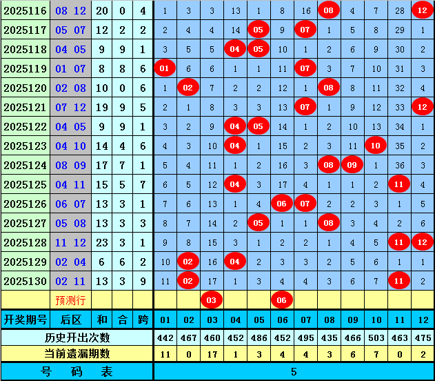 前区第一位:在历史第131期同期开奖中分布范围在02-12区段,平均值为5.8,奇偶比为6:11,目前奇数号码遗漏了1年,今年第131期注意奇数号码回补,关注号码05。