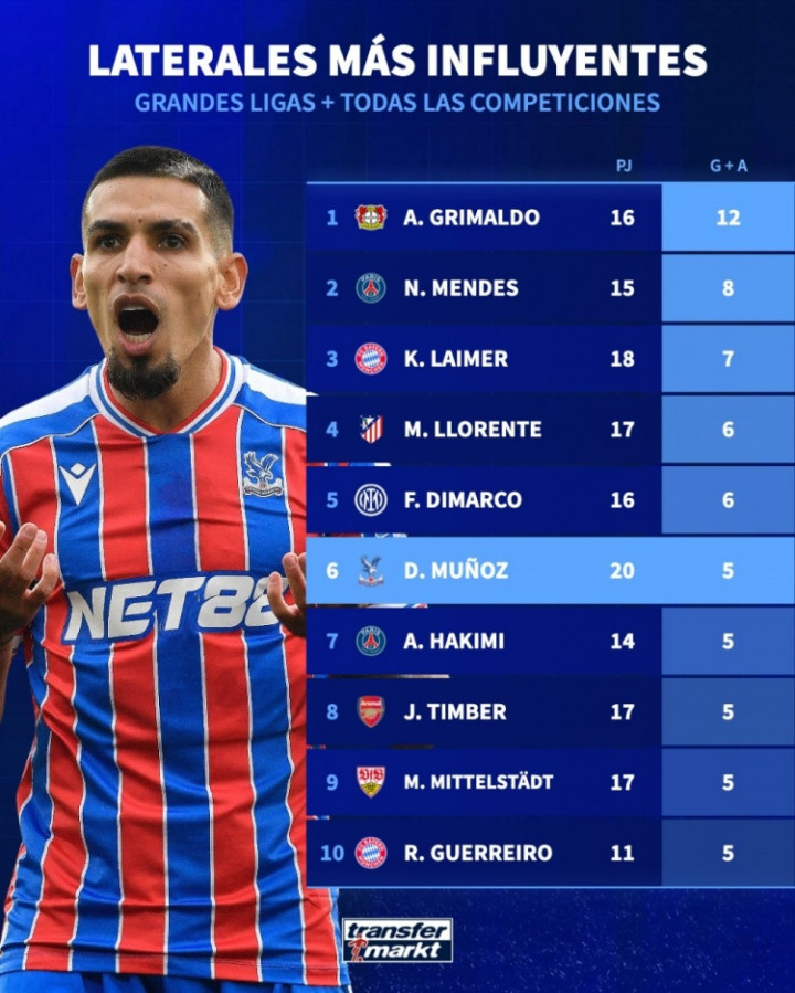 直播吧11月25日讯德国转会市场统计了本赛季五大联赛边卫的参与进球数量,并列出榜单,格里马尔多参与12球居首,努诺·门德斯参与8球次席。