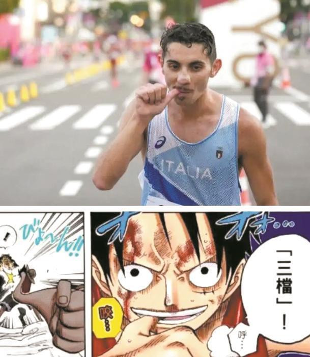 ●意大利选手马西莫·斯塔诺在东京奥运会男子竞走20公里决赛中夺冠,他在夺冠后以咬着大拇指的路飞“三档”形态致敬《海贼王》,还在社交平台上直言路飞的精神带给他巨大的动力。(见下图)