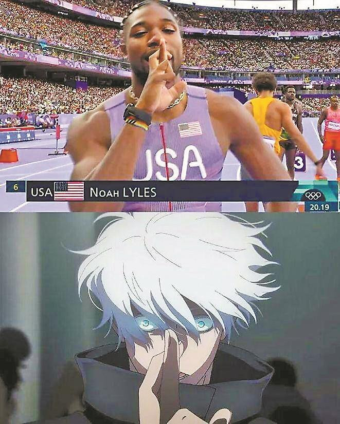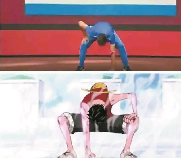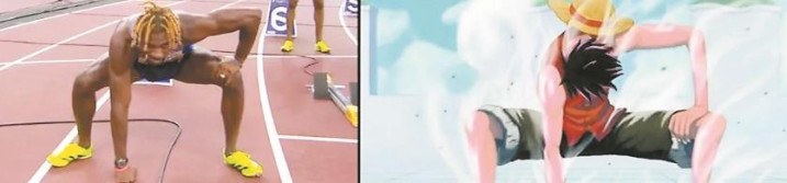 ●美国短跑名将诺亚·莱尔斯无疑是这场“动漫秀”的领头人。他在男子200米半决赛前摆出《海贼王》蒙奇·D·路飞经典“二档”姿势,完美还原了原著漫画中这一经典招式。(见下图)