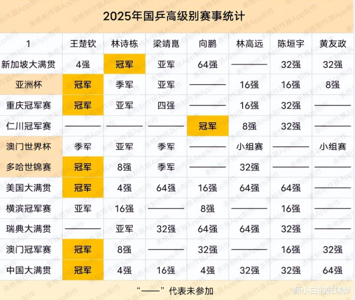 2025年对于王楚钦来说是丰收的一年,男单:亚洲杯冠军、重庆冠军赛冠军、多哈世乒赛冠军、澳门冠军赛冠军、中国大满贯冠军。疲劳但有收获,这可能就是运动员为之努力的一切吧。