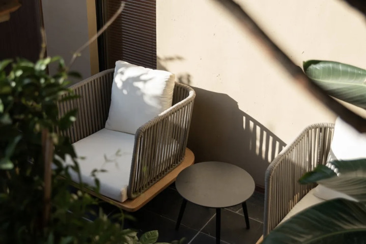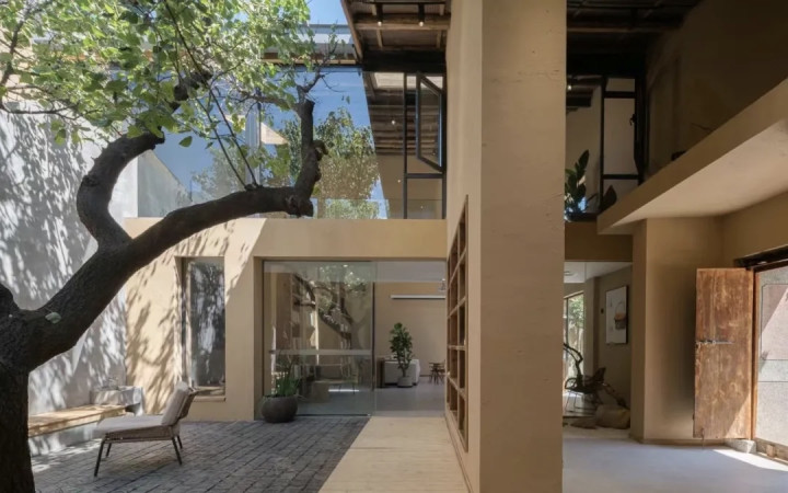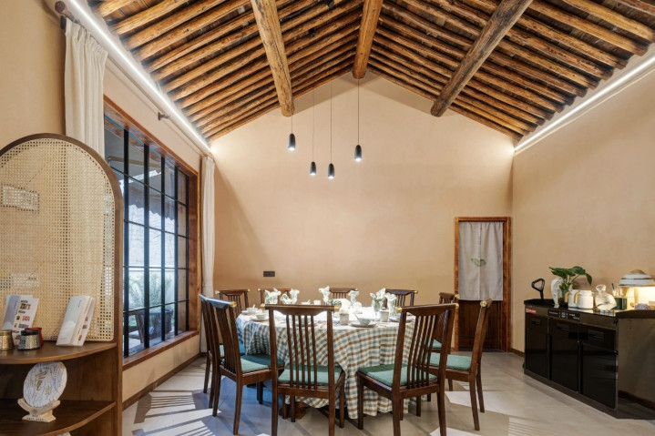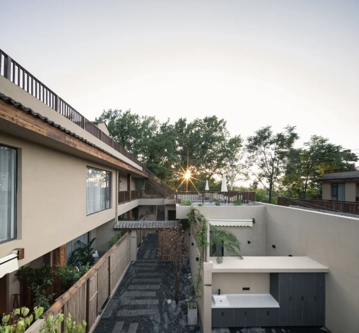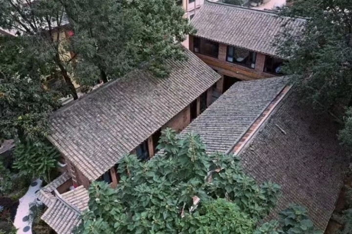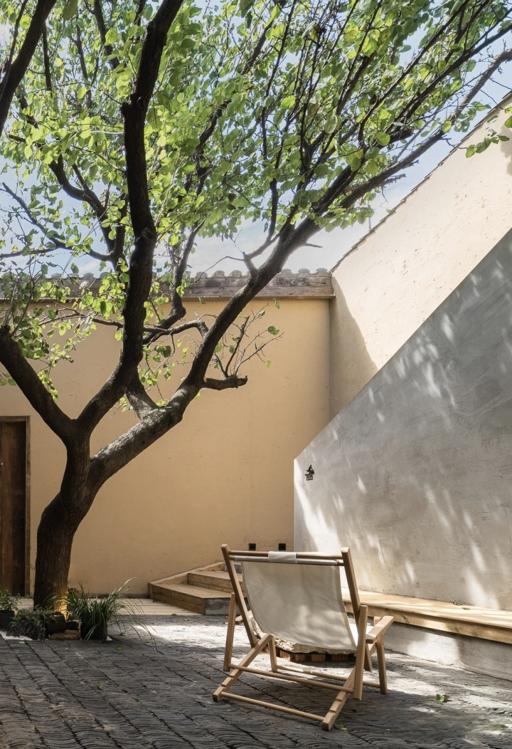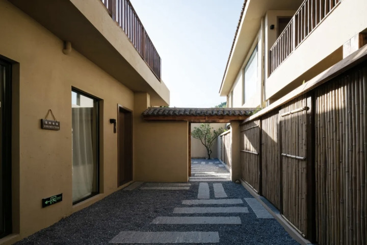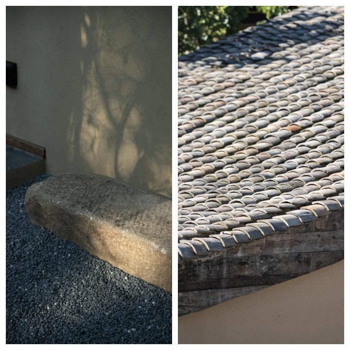 在云裳花栖,空间内所用的设计元素,包括老门、老瓦、老砖,竹子,甚至院子里的石子、杏树、木瓜,都是从本村、本地收来,施工期间,完全对村民开放。