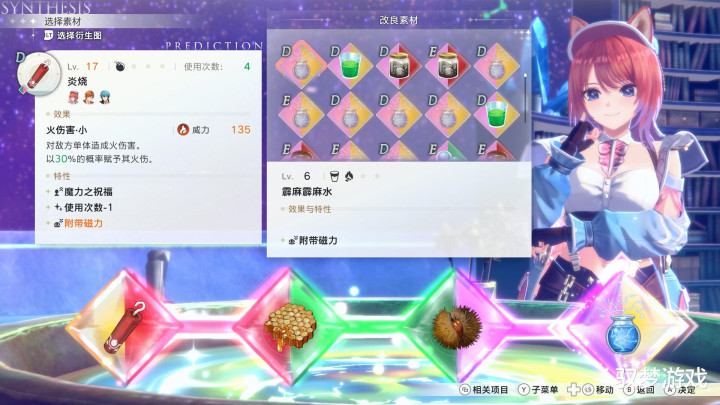 《炼金工房》系列的灵魂始终是 “炼金”,而《红白》最颠覆的创新,是将传统 “按配方投料” 的模式,升级为以 “天赋颜色” 为核心的调合系统。每种素材都带着双色菱形标识,比如 “火焰草” 是红 + 橙,“冰棱石” 是白 + 蓝,调合时只需将相同颜色的方块头尾相接,就能触发特性继承与数值加成;而当投料环全部相连时,才能解锁《莱莎》系列中经典的 “配方变化”,这也是搓出高阶道具的唯一途径。
