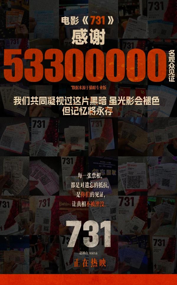 据网络平台数据,截至2025年10月18日12时,电影《731》累计观影人次突破5330万。