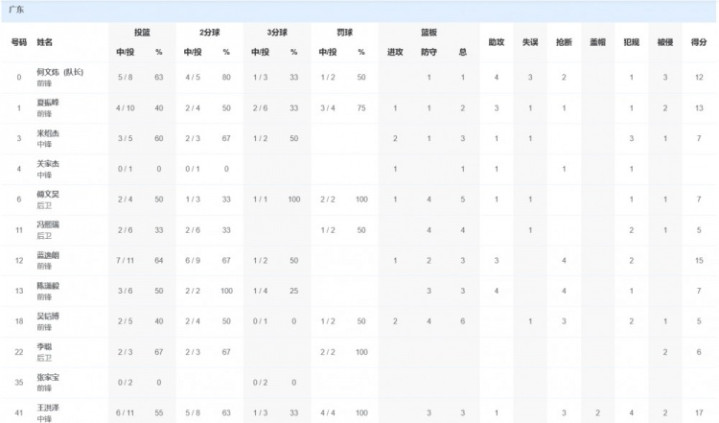 广东队方面,王洪泽17分3篮板1助攻,蓝逸朗15分3篮板3助攻,夏振峰13分2篮板3助攻。