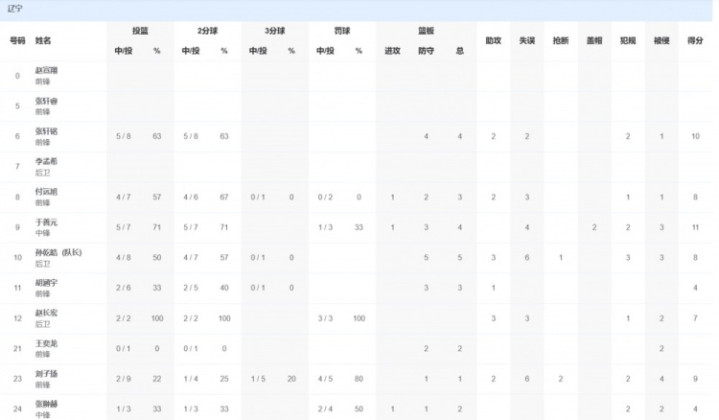 辽宁队方面,于善元11分4篮板,张轩铭10分4篮板。