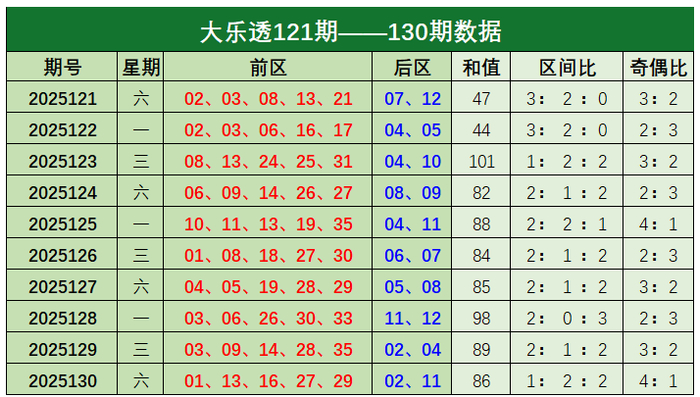 大乐透第2025130期出奖号统计:前区01、13、16、27、29,后区02、11。和值为86,区间比为1:2:2,奇偶比为4:1。