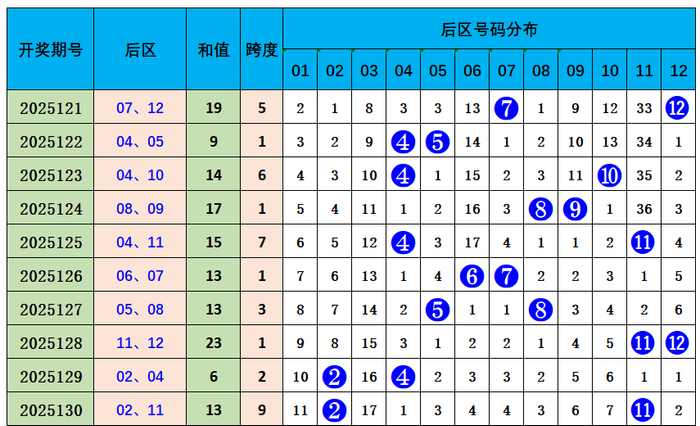 二区(13-24):上期开出2个号码,最近10期该区开出14个号码,出号较冷,本期预计会开出1个奖号,推荐奖号23。