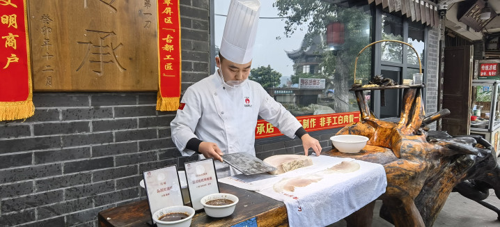 结果被门前展示刀功片白肉的大厨吸引进了“何三白肉第一刀”店,