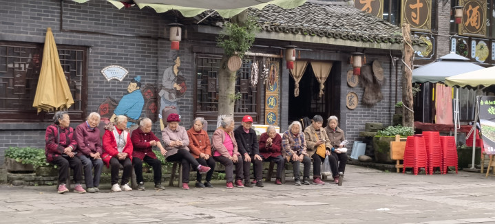 十二位七、八十岁的老人“一字”排开地坐在酒家门前,